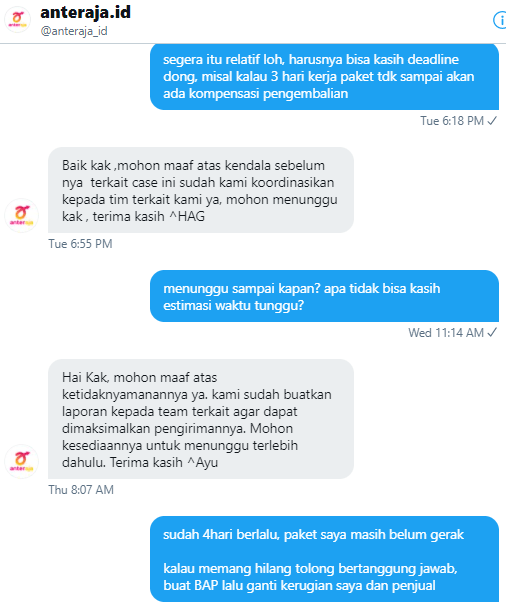 Anteraja merupakan salah satu ekspedisi mitra tokopedia yang menawarkan program. Review jasa pengiriman anteraja · assalamualaykum, hello guys sudah lama yaa gak nulis lagi di blog ini hehe · oke jadi disini gua akan sharing . Buka twitter buat komplain hingga akhirnya menemukan banyaknya orang yang komplain dibandingkan puas dengan layanannya dan bahkan review di . Beberapa hari kemarin, kami membeli produk di salah satu . Review jasa pengiriman anteraja 2022 kali ini saya buat berdasarkan pengalaman pribadi ketika berbelanja di shopee.